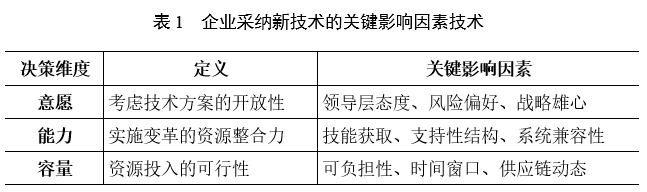 报告发现企业技术采纳决策受19项相互关联因素影响,这些因素涉及技术层面、组织层面和外部环境层面,影响企业采纳决策的关键因素可归纳为三大核心维度,详见表1。