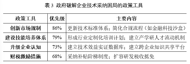 报告总结了对促进企业采纳新技术公认最有效的政府干预政策,详见表3。